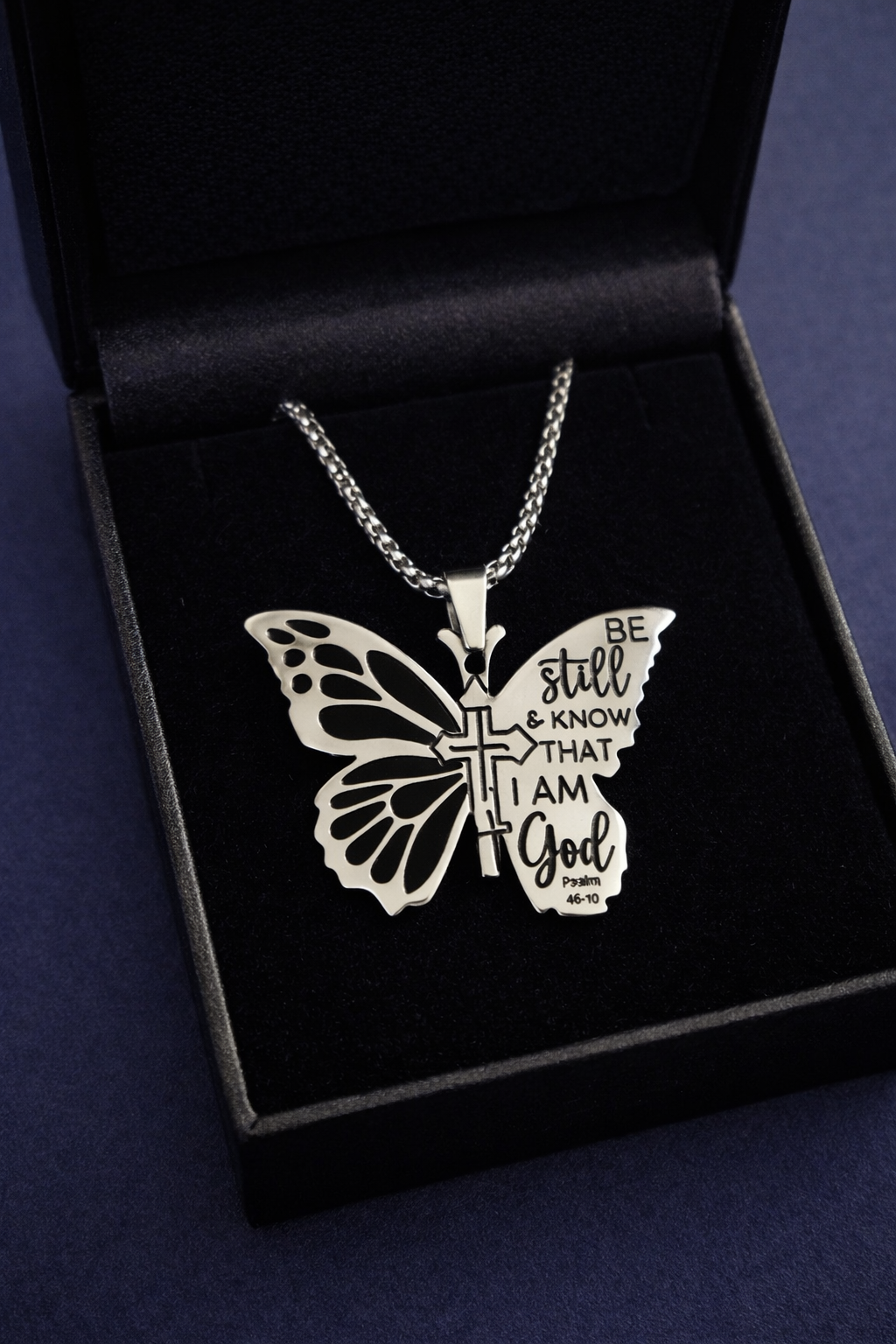 This elegant butterfly pendant necklace is engraved with “Be still and know I am God”. Crafted with a high-shine silver finish and paired with a durable chain, this piece makes a meaningful gift or a daily reminder of faith, hope, and peace.