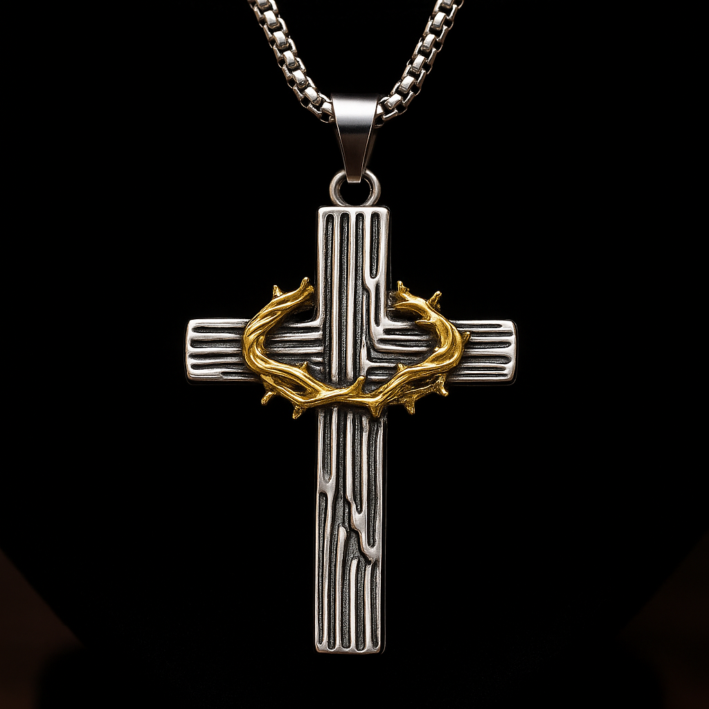 Wear a powerful symbol of sacrifice and victory with this Cross Necklace. Featuring a rugged cross with a detailed gold crown of thorns, this pendant reflects Christ’s suffering and triumph over sin. With its bold design and sturdy chain, it’s perfect as a men’s Christian necklace, a meaningful gift, or a daily reminder of faith and devotion.