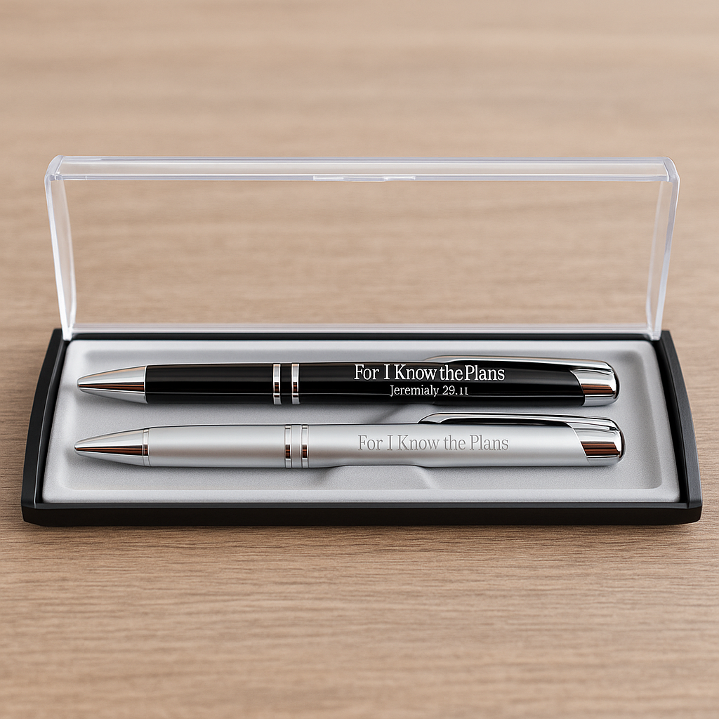 Write with inspiration every day with this elegant Jeremiah 29:11 Scripture Pen Set. Featuring one black stylus pen and one silver pencil — each engraved with the timeless promise “For I Know the Plans” (Jeremiah 29:11), this gift set is perfect for personal use or as a meaningful present.